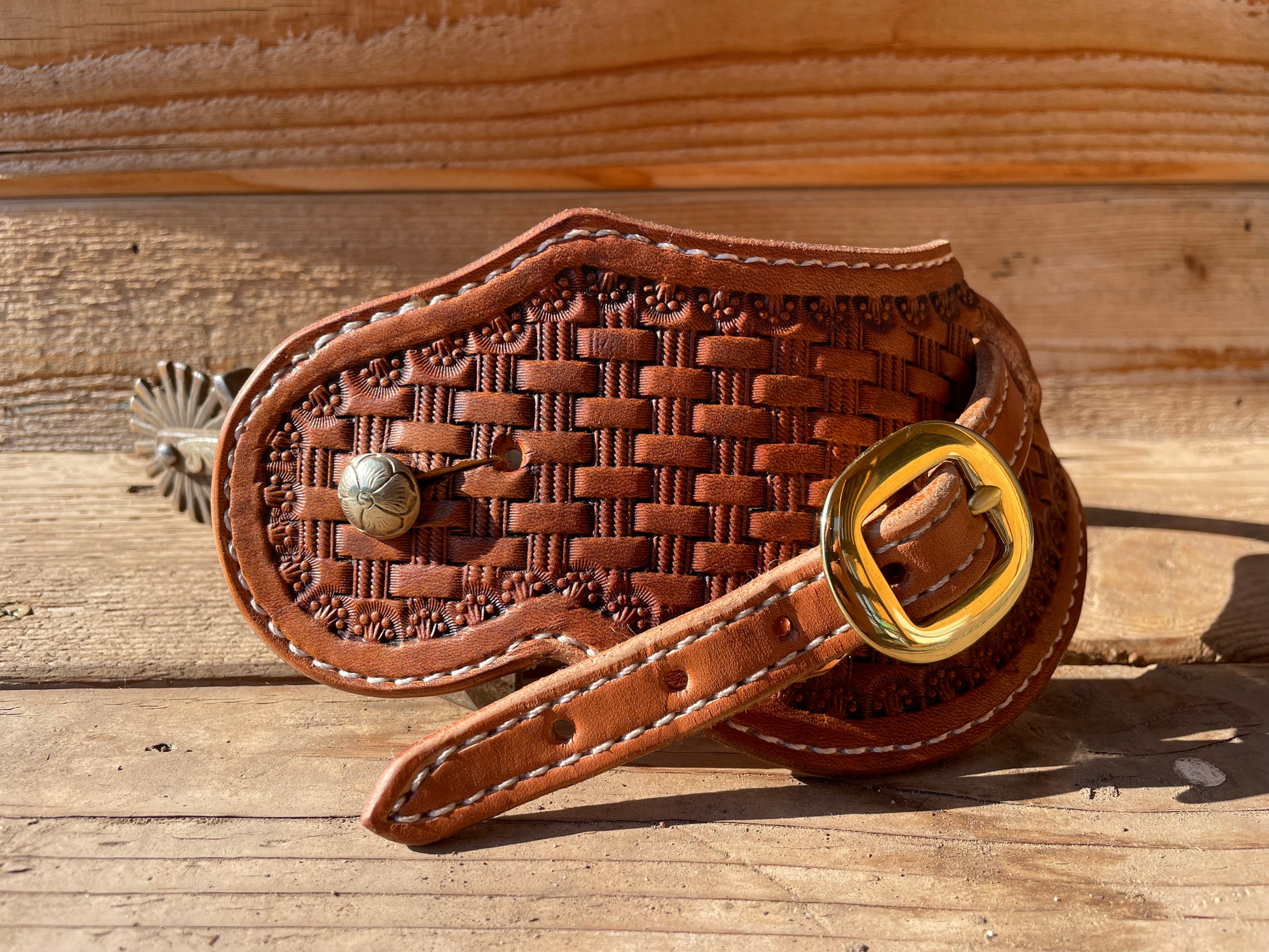These western spur straps are completely hand made from real American leather. The basketweave pattern is stamped by hand.